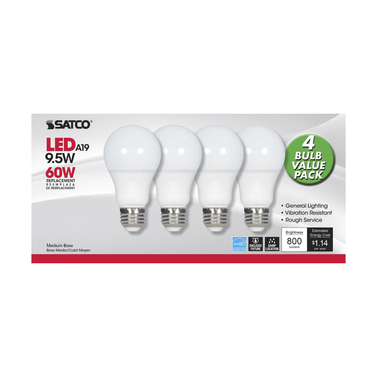 LED 4 Pack A19 9.5 W Frost/ Non-Dimmable 120 Volt/ E26 Medium Base/ 800 Lumens