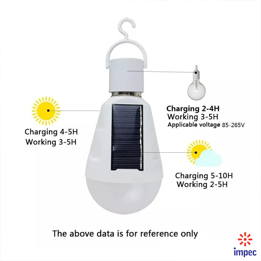 -E27 base type, after electric power charging it for about 6-8 hours, it could work 4-6 hours, and after solar charging for about 1 day, it could work 2-3 hours.