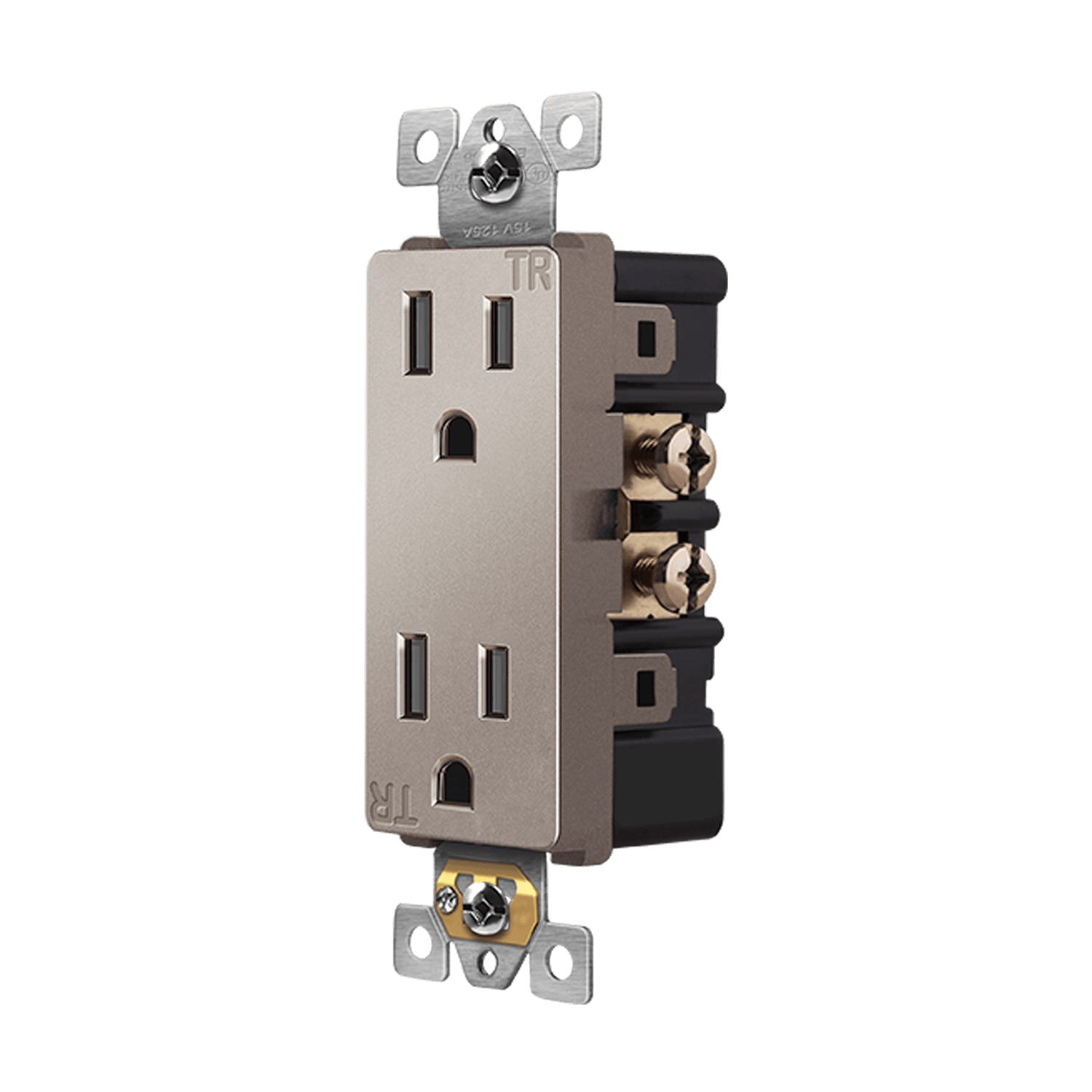 Self-grounding tamper-resistant receptacles are made of high-impact resistant polycarbonate thermoplastic for long service lives. The shallow body design is for maximum wiring, with backstab or side options available. Tamper-resistant shutters prevent foreign objects from being inserted into the device. These residential grade receptacles are suitable for use in homes, apartments and condominiums. They are also applicable for commercial use in corporate buildings, hotels, restaurants and locations that only require a 15-amp outlet.