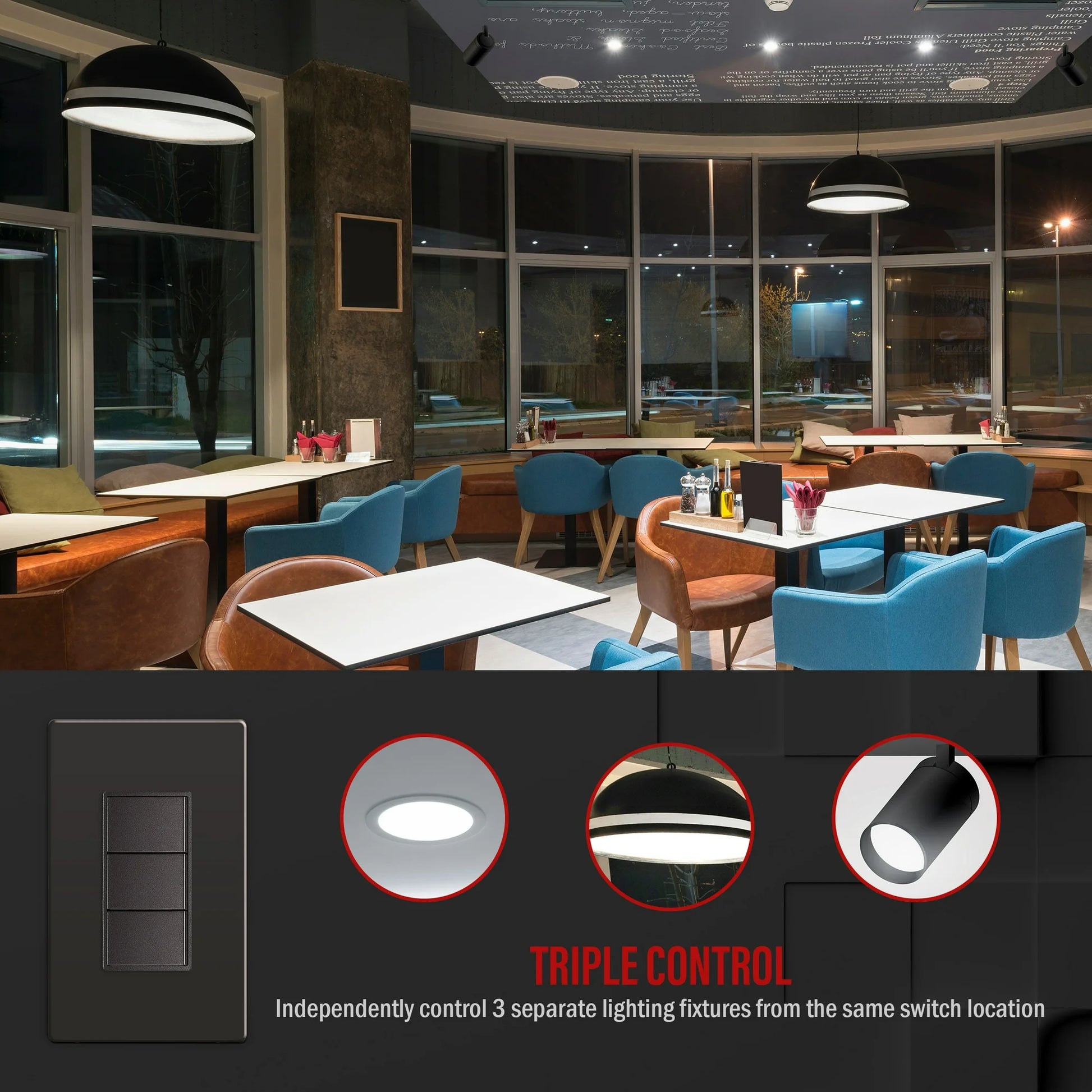 The ENERLITES 62755 switch makes installation quick and simple with its versatile design. This device features three switches that control three separate fixtures in a single wall box. The impact resistant thermoplastic body is built strong to endure years of use as well as being resistant to a wide temperature range. You can transform the look of your home and increase its resale value with these modern switches.