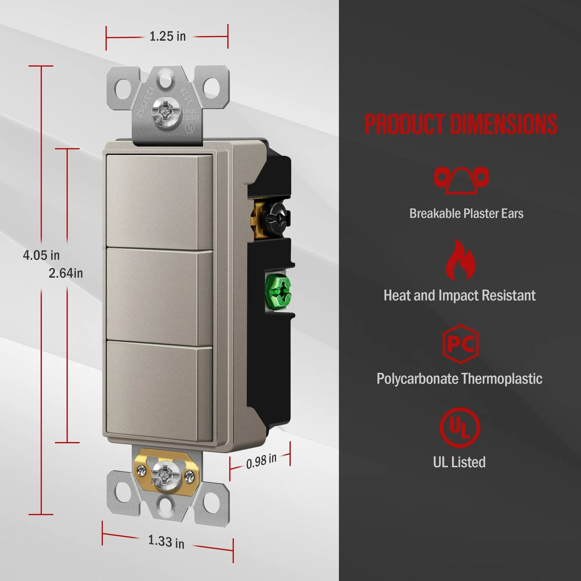The ENERLITES 62755 switch makes installation quick and simple with its versatile design. This device features three switches that control three separate fixtures in a single wall box. The impact resistant thermoplastic body is built strong to endure years of use as well as being resistant to a wide temperature range. You can transform the look of your home and increase its resale value with these modern switches.